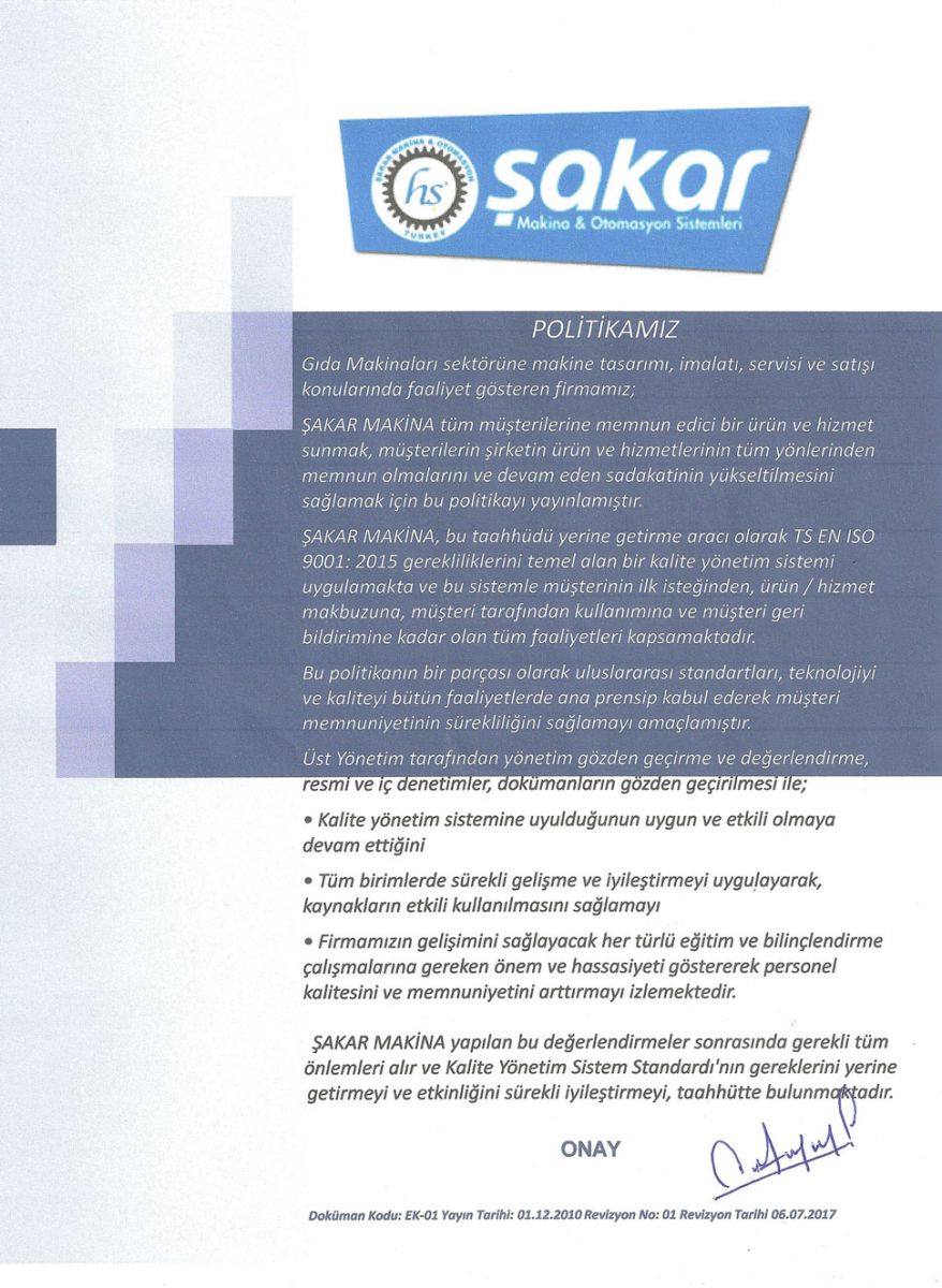 Şakar Makina - Gıda Makineleri sektöründe etik çalışma ilkelerimizi göz ardı etmeden mevcut ve olası Müşteri talep, ihtiyaç ve beklentileri doğrultusunda hızlı ve doğru çözümler üreten Lider Kuruluş